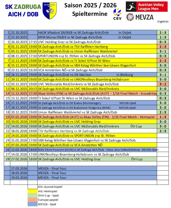 Spieltermine und Ergebnisse des SK Zadruga Aich/Dob (Herren I) im Meisterschaftsjahr 2025/2026 auf einen Blick: